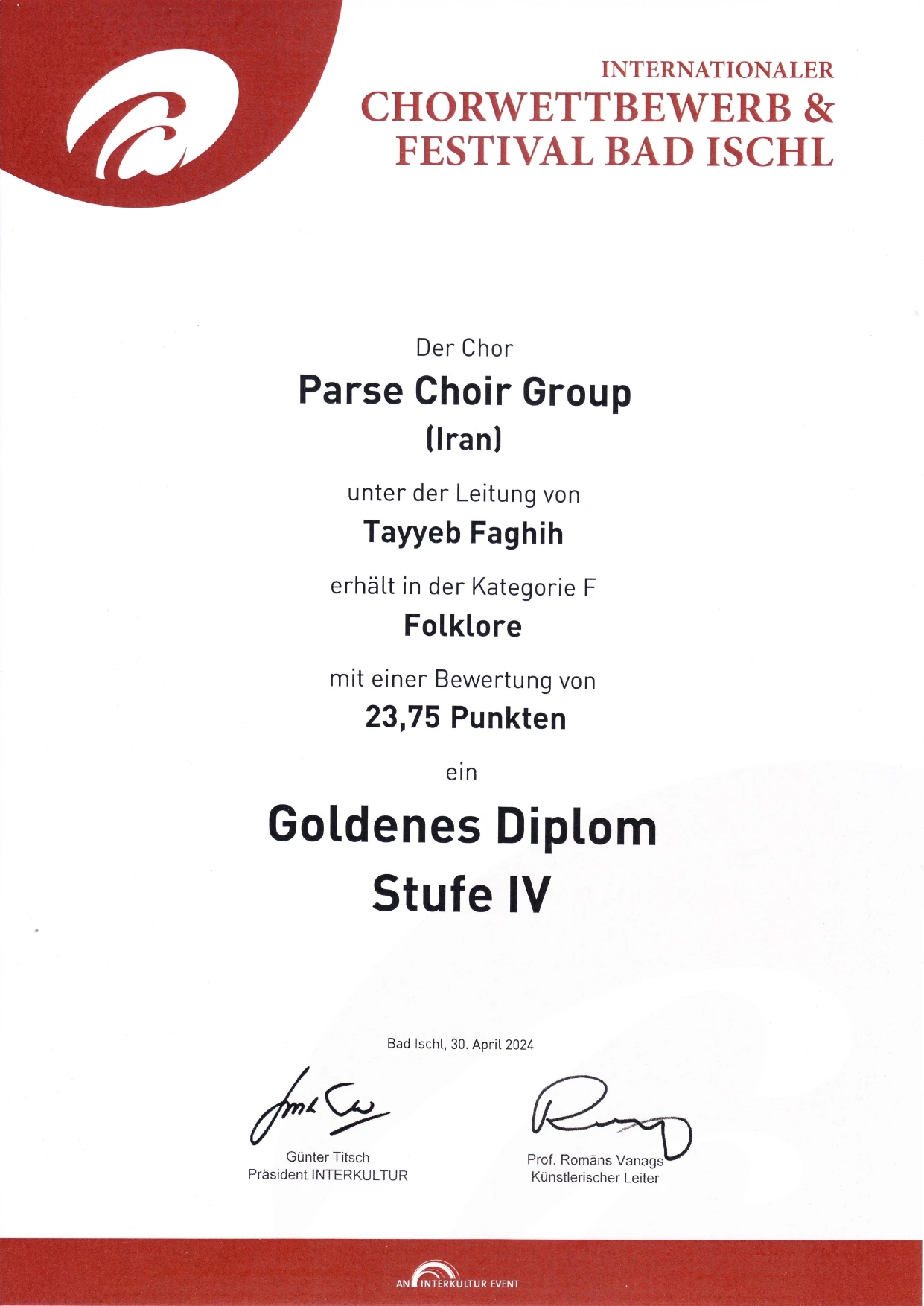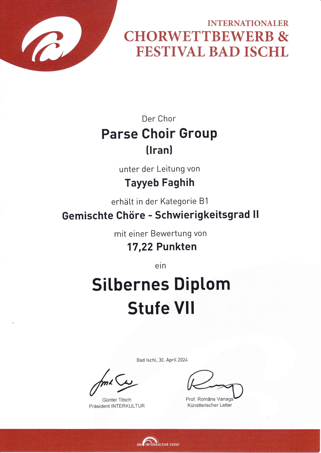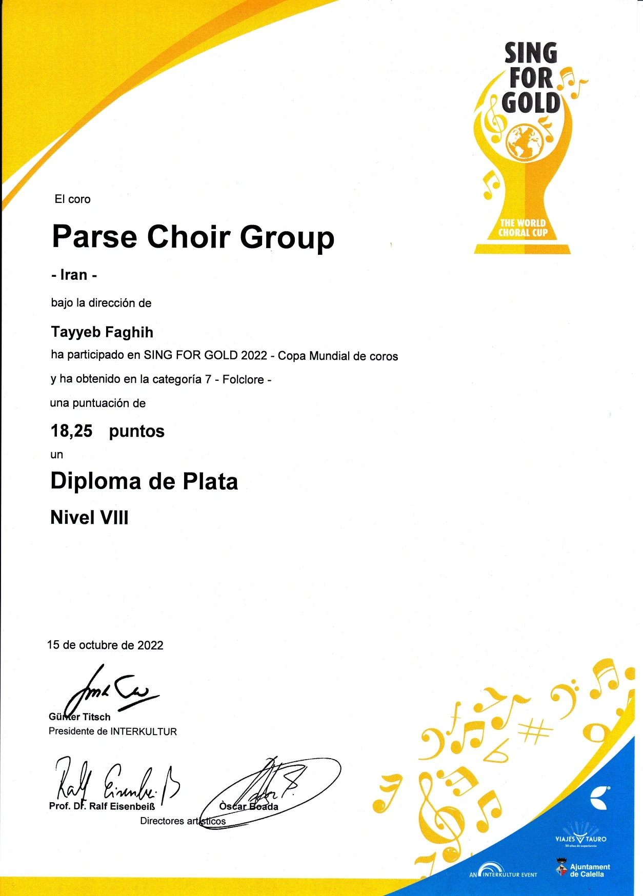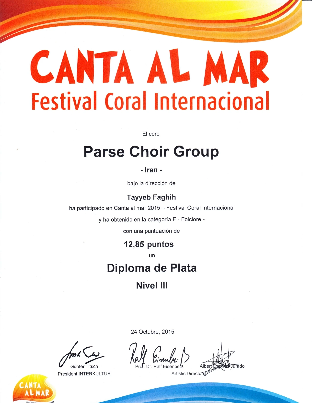 دریافت دیپلم نقره بخش فلکلور جشنواره بین المللی گروههای کر دنیا اسپانیا