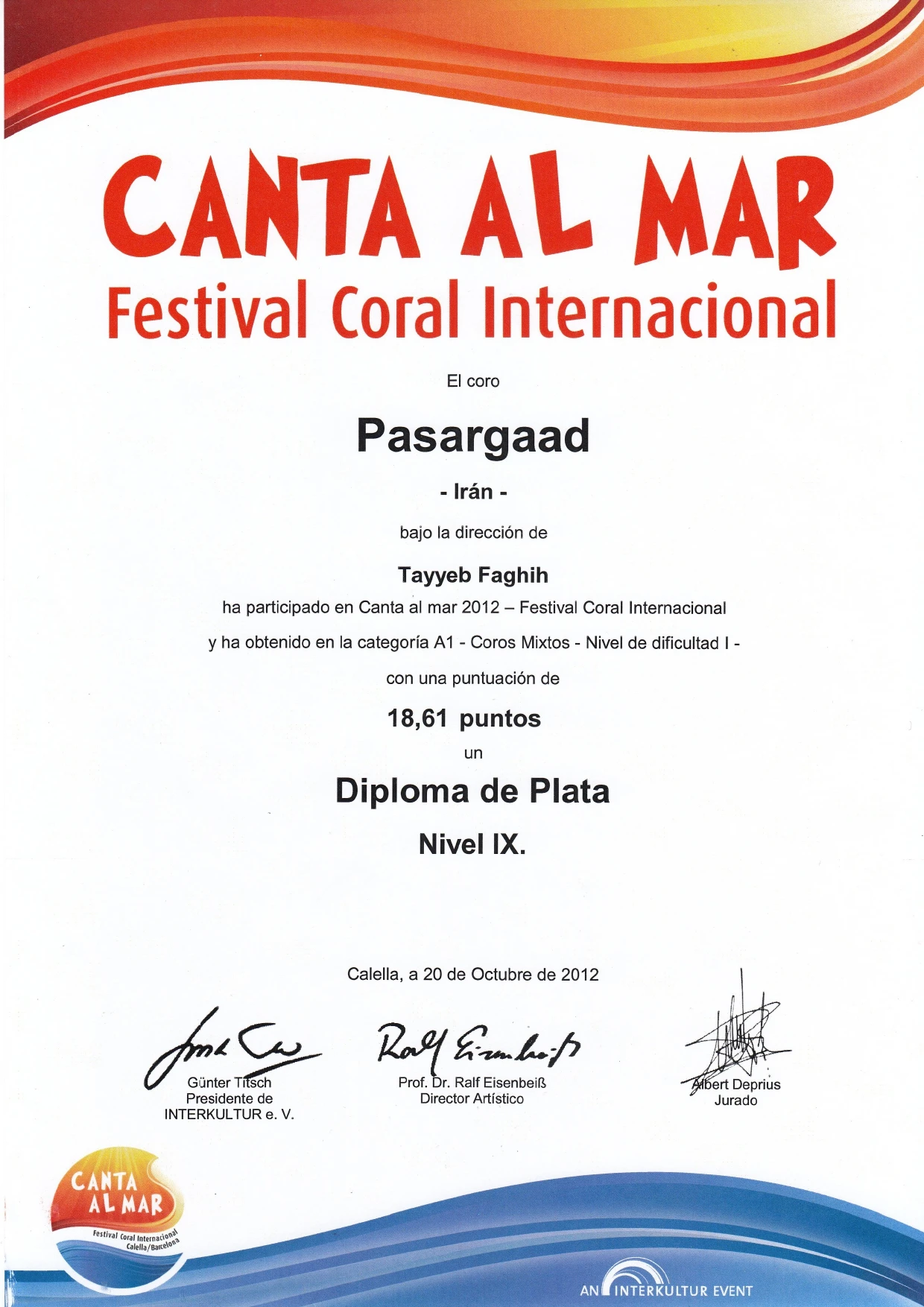 دریافت دیپلم نقره بخش میکس کر جشنواره بین المللی گروه های گر دنیا اسپانیا مهرماه ۱۳۹۱