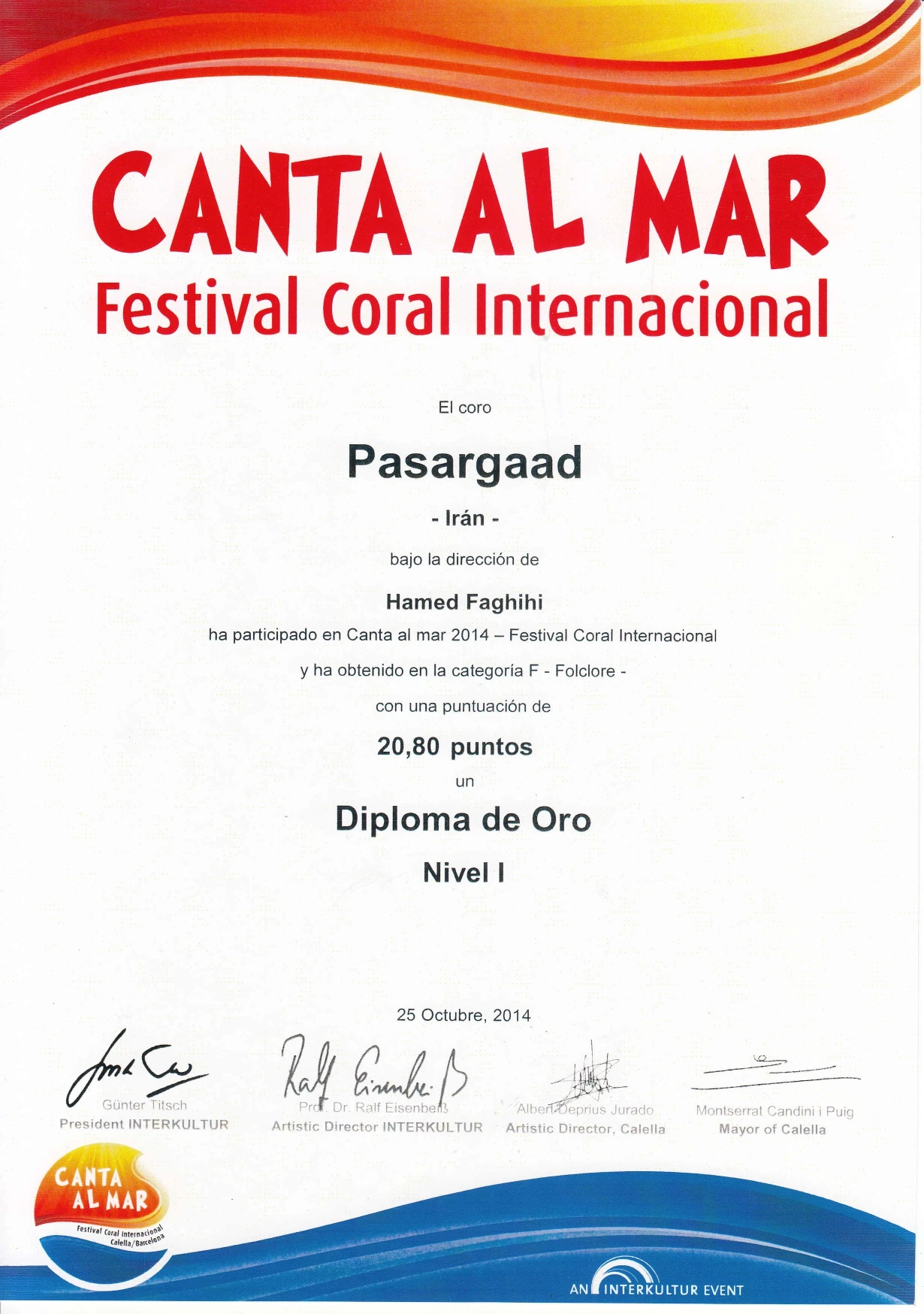 دریافت دیپلم طلا بخش فلکلور جشنواره بین المللی گروههای گر دنیا اسپانیا آبان ۱۳۹۳