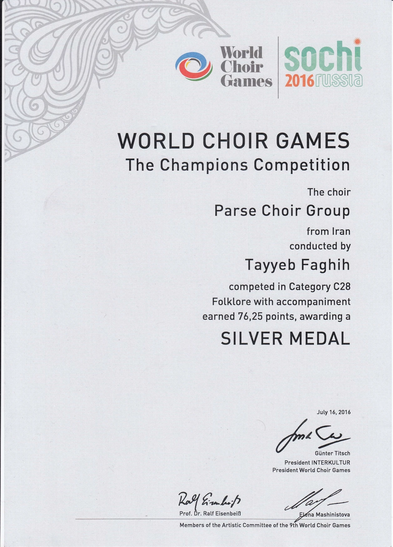 دریافت مدال نقره بخش فلکلور مسابقات جهانی گروههای کر دنیا روسیه ۱۳۹۵
